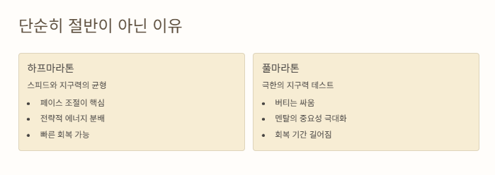 거리만 보면 절반이지만, 체감 난이도는 단순히 50%로 줄어들지 않는다. 하프마라톤은 스피드와 지구력을 동시에 요구한다. 풀마라톤이 ‘버티는 경기’라면, 하프마라톤은 페이스 조절이 핵심인 경기에 가깝다. 초반 오버페이스는 후반 급격한 체력 저하로 이어지기 쉽다.