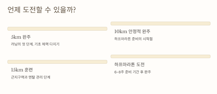 보통 10km를 무리 없이 완주할 수 있다면, 하프마라톤 도전이 현실적인 단계로 여겨진다. 다만 거리 자체가 길기 때문에 최소 6~8주 정도의 준비 기간이 권장된다. 특히 15km 이상부터는 근지구력과 멘탈 관리가 중요해진다. “아직 절반도 안 남았다”는 생각이 들 때부터가 진짜 시작이다.
